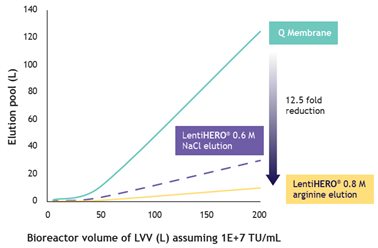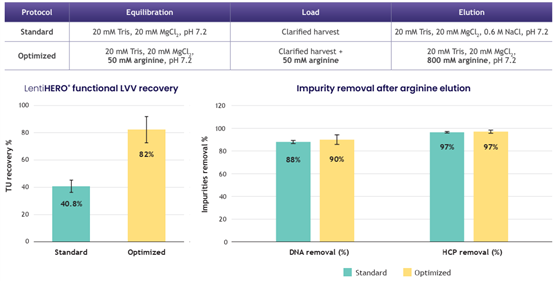 用0.8M精氨酸洗脫,HSV回收率可達到69%,LentiHERO®載量可達1.4E+8 IU/ml,同時實現高效的雜質去除。